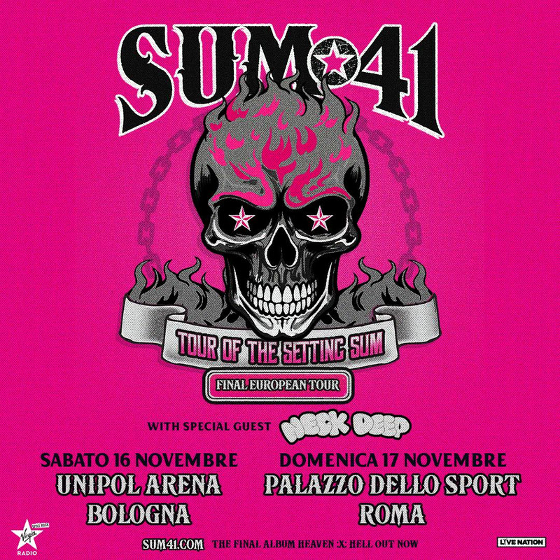 I Sum 41, band nominata ai Grammy, hanno annunciato ulteriori date del Tour Of The Setting Sum nel Regno Unito e in Europa. Gli spettacoli, che li vedranno partire dall’Europa il 21 ottobre, raggiungeranno il Regno Unito il 26 ottobre per sei date, tra cui la OVO Wembley Arena. Il supporto alle date italiane è affidato ai Neck Deep con l’ultima tappa europea, a Parigi, in Francia, davanti a una folla già esaurita di 35.000 fan.